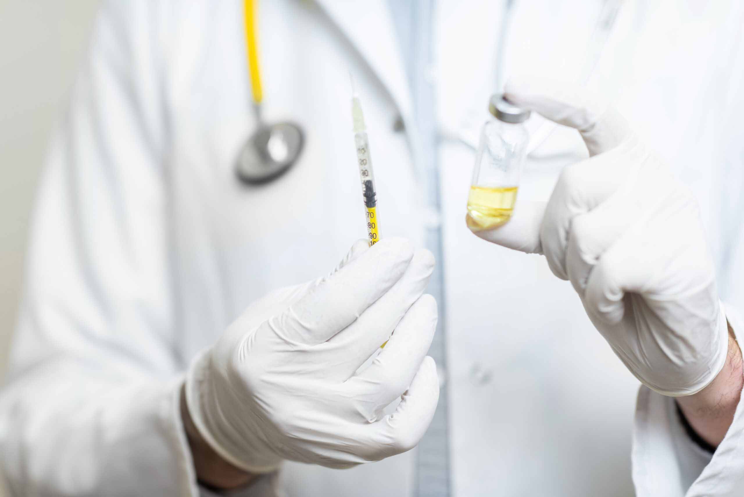 Doctor holding syringe with some medication or vaccine, close-up view focused on hands in medical gloves