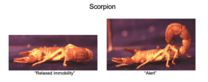 The scorpion is an arthropod, another invertebrate, whose evolutionary history goes back to the Silurian period 435 million years ago. We explored sleep-like behavior in two species of tropical scorpions. As with the cockroaches, three different states were identified based on body posture, arousal threshold and heart rate. The animals were subjected to 12-hour periods of rest deprivation by mechanical stimulation. The result was a period of increased immobility that subsequently returned to baseline. Thus, just as with the cockroach, the scorpion showed a sleep-like regulatory process in which rest deprivation elicited a restorative response.