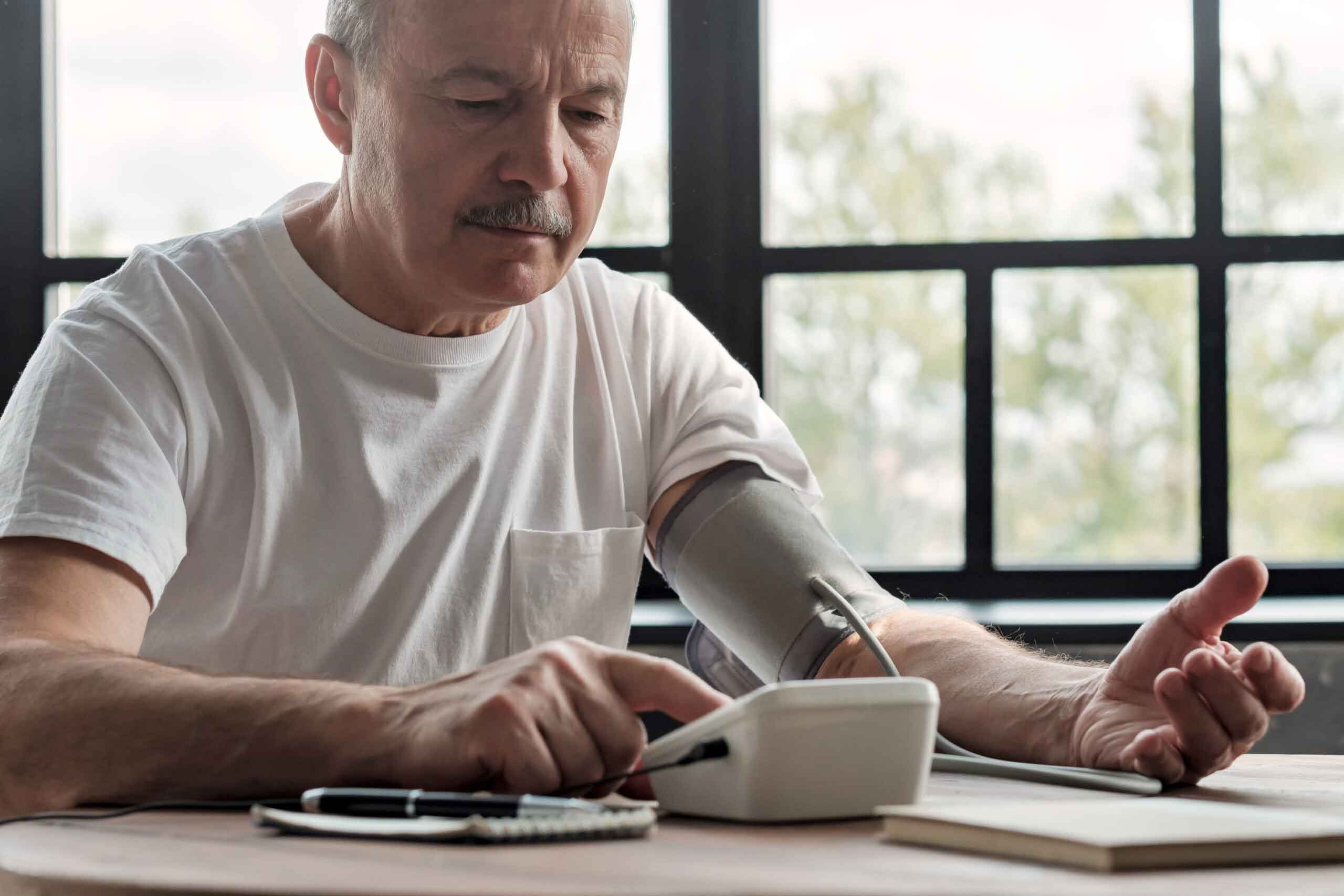 Old hispanic man feeling bad using a home blood pressure machine to check his health in the morning